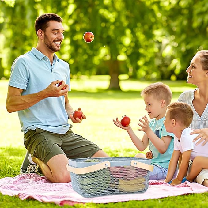Portable Mesh Harvest Basket - Natural Bamboo Handle Foldable Organizer for Kitchen, Garden & Picnic | Ventilated Storage Bin with Rust-Proof Wire, Space-Saving Farmhouse Decor (Blue)