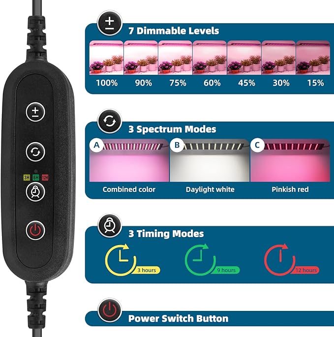 - Full Spectrum Grow Light: Included with the indoor greenhouse is a 2FT 40W high-output and IP65 water resistant plant light panel that has three spectrums to meet your plants' needs at different stages. It also features 7 brightness levels and 3 timing functions (3H/9H/12H), is color-changing, dimmable, and has a timer that repeats daily based on your settings