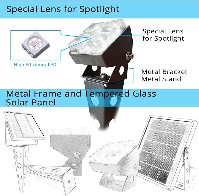 - 【Super Bright Color Changing Spotlight】Mii-PWR Color Changing Solar Lights Outdoor with three light heads, the solar panel is made of tempered glass and aluminum frame which can last longer than common plastic solar panel. The Aluminum spotlight head comes with metal stake which is much better than common plastic spotlight.