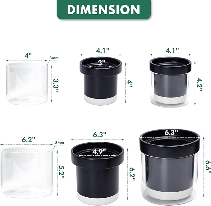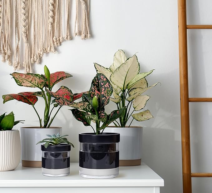 Phoenix Vine 6 Inch 4 Inch Self Watering Terracotta Planter, Black Terracotta Clay Pot with Glass Reservoir for Indoor Plants, Herbs, Flowers, 52-C-G-46