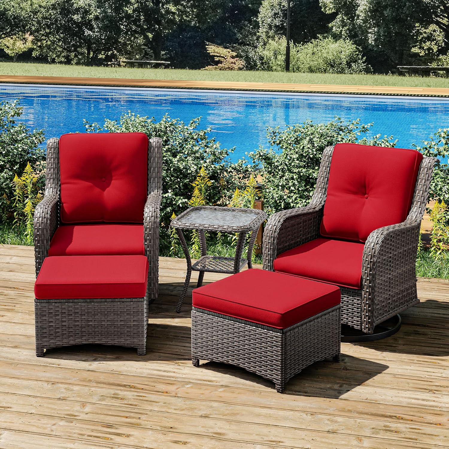 Joyside 5 Piece Outdoor Patio Furniture Set Wicker Conversation Bistro Set Swivel Rocking Chairs with Side Table and Ottomans for Backyard, Porch, Deck(Mixed Grey/Red)