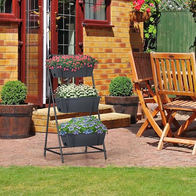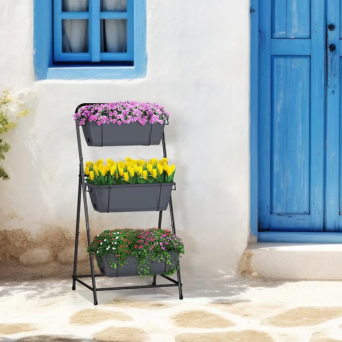 Vertical Garden Planter 3 Tier Raised Garden Bed Herb Garden Planter Outdoor Standing Garden Planter Box with Drainage Holes Removable Tray for Patio Balcony Porch Grey