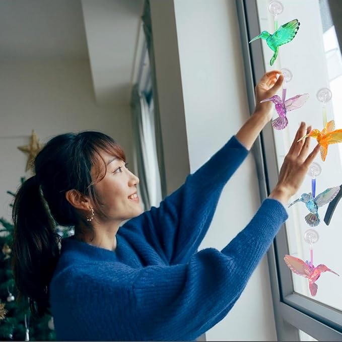 - 【ENOUGH QUANTITY AND VARIOUS STYLES】Set of 6 iridescent hummingbirds in Clear,Purple,Blue,Gold,Pink and Green With 6 Suction Cups and Ribbon for Hanging Windows/Car.