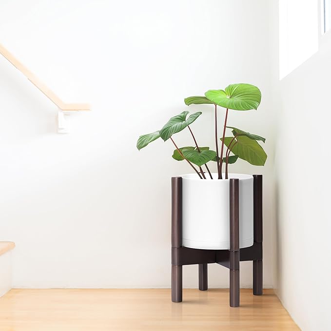 - A Complete Set: Minimalist plastic planter, combined with a sculptural, solid wood stand that match perfectly together and looks great in any home.