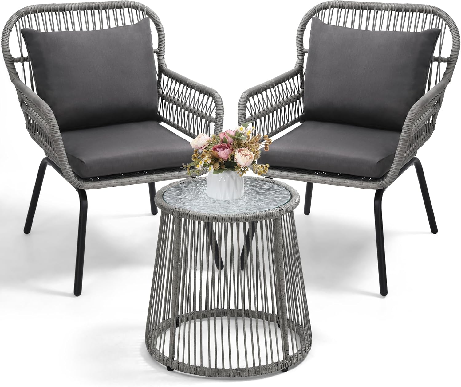 3 Pieces Rattan Wicker Bistro Set, Outdoor Conversation Set, Wicker Rattan Furniture Set with Glass Top Table, Space Saving for Balcony, Backyard, Grey