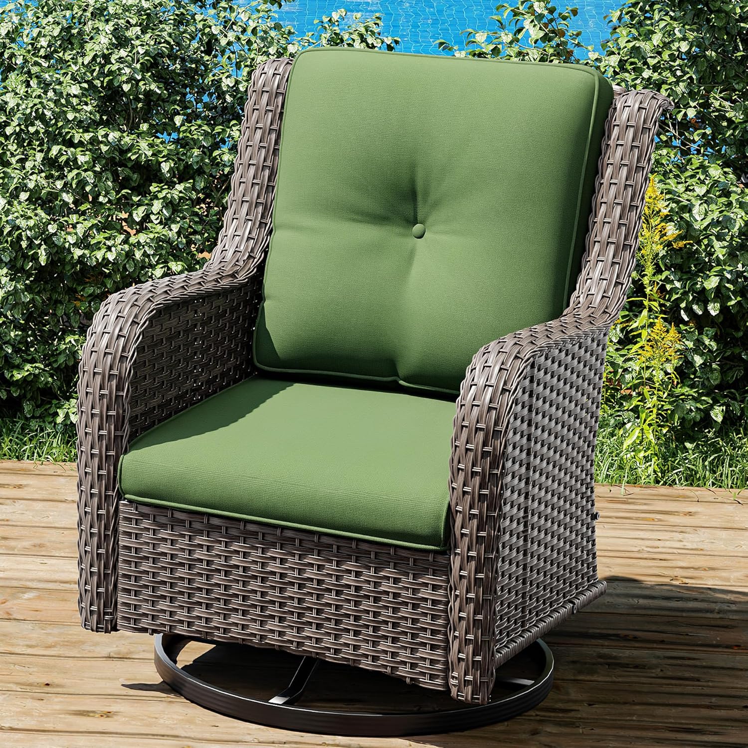 - Ergonomic Structure: This wicker swivel patio chairs have comfortable streamlined seats, ergonomically designed backrests and widened armrests which can provide the utmost comfort. The thick and soft back & seat cushions make you feel more comfortable to sit on and enjoy your patio leisure time