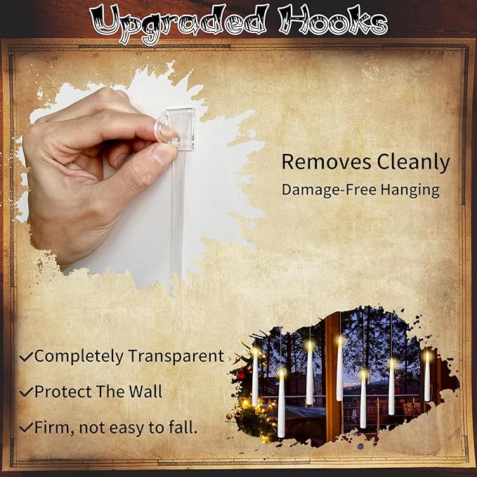 - 【FLOATING CANDLES】It's a fun way for children to hanging candles into the ceiling or fix these electric candles on the window, wall decoration with hook , perfect room decor for Halloween decorations, church services, window candles, the fireplace, table, home & outdoor decoration.