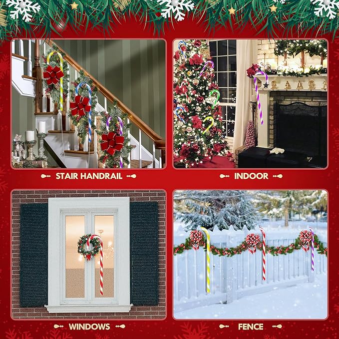 - 【2-in-1 Installation: In-ground or Hanging】 For in-ground installation, simply attach the candy cane marker to the stake and install it in the ground. This is ideal for decorating the walkway, lawn, yard, front door, garden, or pathway. Alternatively, the candy cane lights can be hung on Christmas trees, plants, stairs, stair handrails, decks, patios, windows, or fences. They are also an excellent option for indoor home decor, infusing a cozy touch into your home during the holiday season.