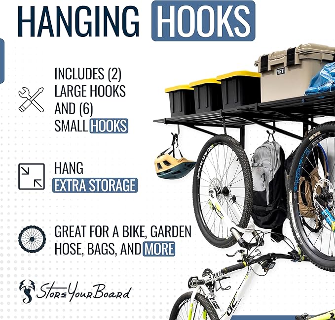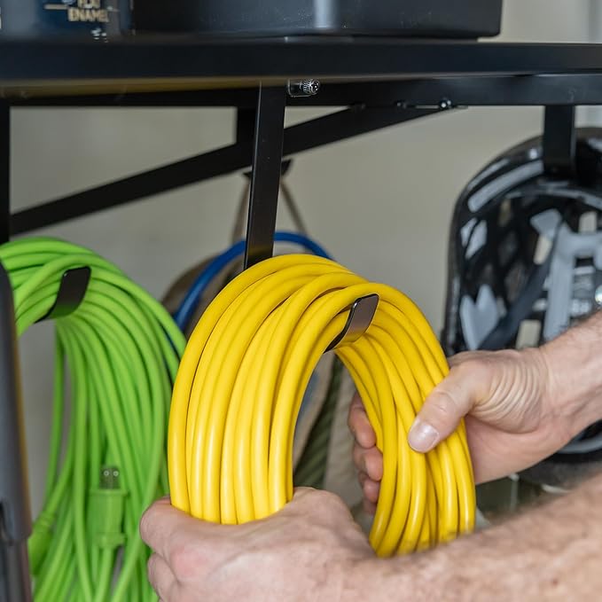 - INCLUDES STORAGE HOOKS – Comes with 2 large and 4 small garage hooks for added hanging storage under each wire shelf. Use the hooks for cords, garden tools, bags, or garage wall organizer systems. Maximize vertical space while keeping frequently used tools within reach.