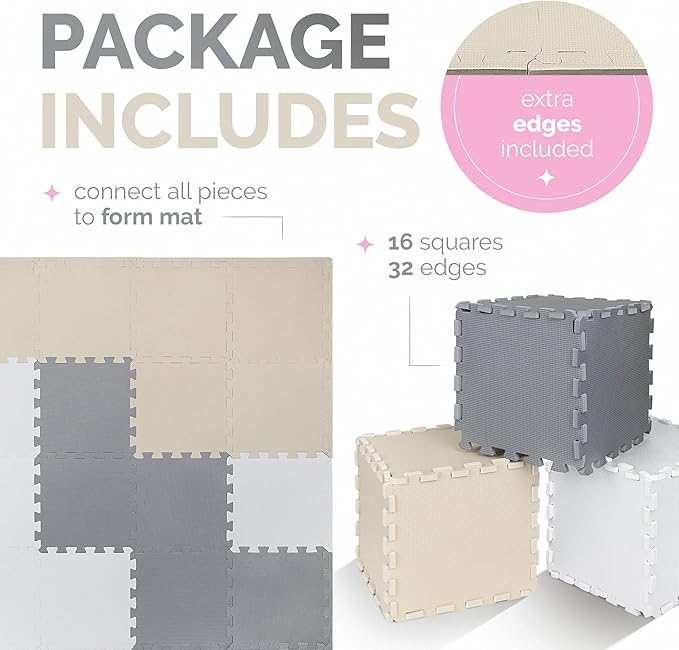 TOYVELT Foam Puzzle Floor Mat for Kids 12x12-16 Interlocking Play Mat Tiles with Colors - Educational Large Puzzle Foam Floor Tiles for Crawling, Non-Toxic - Cream-Gray-Beige