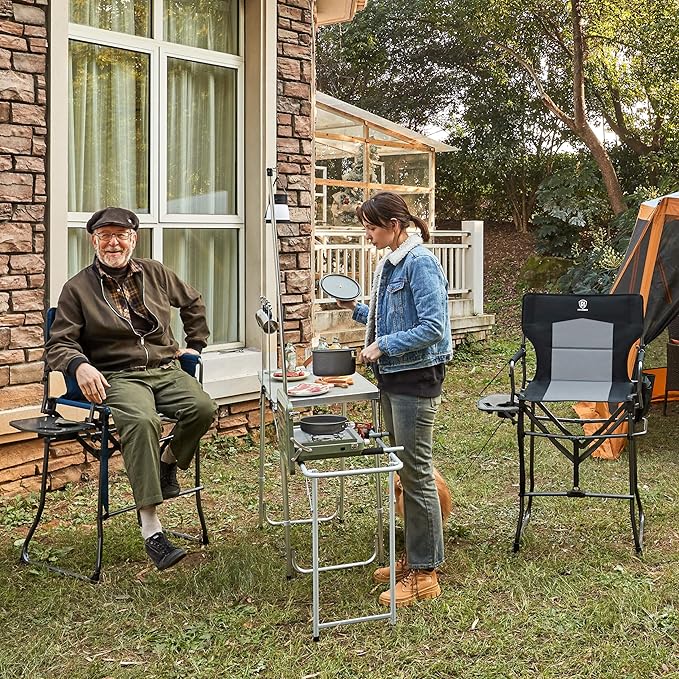 EVER ADVANCED Portable 30.7" Seat Height Tall Folding Chair Directors Chair High Foldable Bar Stool with Side Table for Makeup Artist, Camping, Sports Event, Craft Show, Supports 350LBS Blue Grey