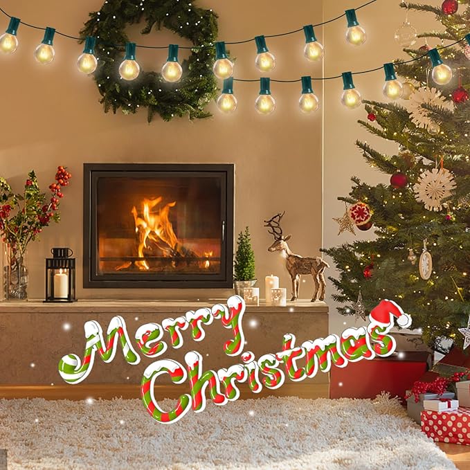 - Outdoor String Lights: 25 Feet Christmas outdoor string lights with 27 G40 clear incandescent bulbs(2 spare), globe light bulbs are 2.36" tall by 1.57" wide, G40 Outdoor string lights have E12 candelabra socket base for Indoor home Outdoor patio decor.