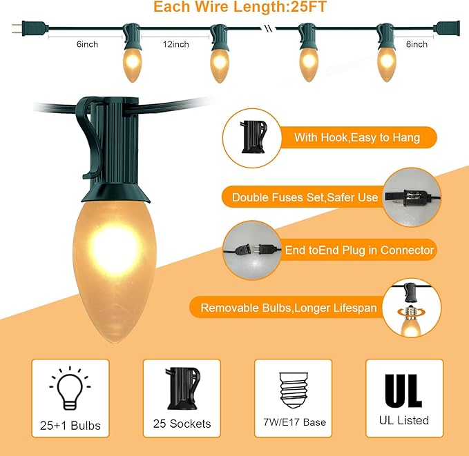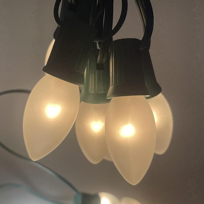 - Vintage Frosted Christmas Lights: Frosted Christmas Lights feature incandescent lamps in a stunning Frosted White color, adding a touch of elegance to any setting. The classic E17/C9 candelabra socket base ensures a secure fit, and with 25 bulbs plus 1 replacement bulb, you can enjoy continuous enchanting glow.
