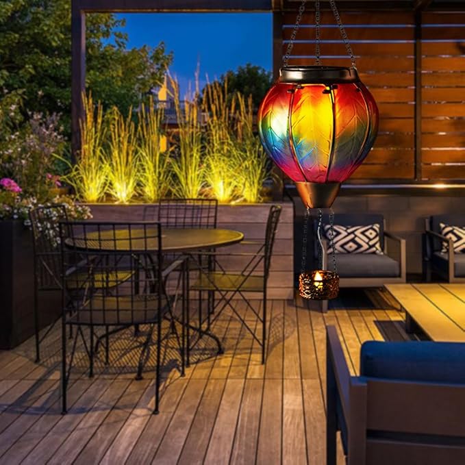 - 【Hot Air Balloon Solar Lantern】Our hanging solar lanterns have been updated with bright colors, unique hot air balloon shapes and small candles in the basket. When the hot air balloon solar lantern is lit, the flashing flame lamp and the candlelight in the basket make it more like a hot air balloon that is rising, creating a stunning visual effect, and also placing our good wishes to give people warmth.