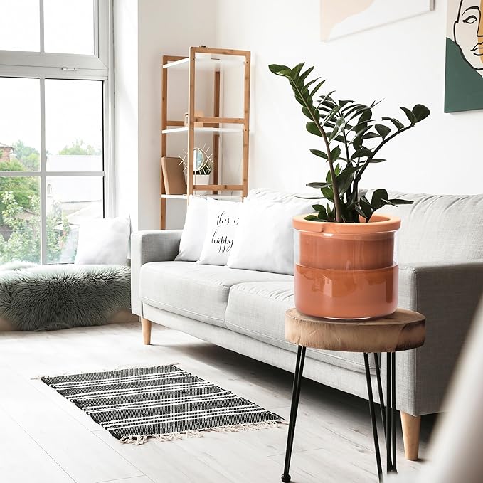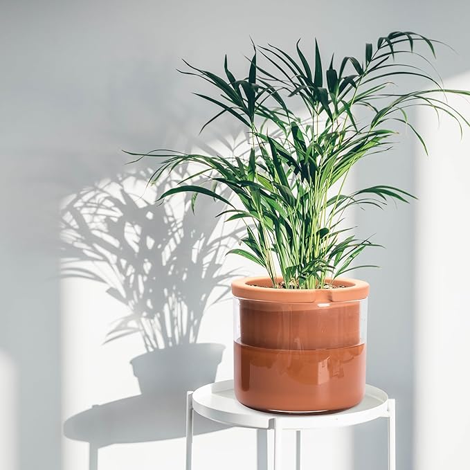 - Terracotta + Glass: Elegant modern design self watering plants pot with ingenious natural breathable terra cotta material and clear glass container. See the water surplus just from a glance.