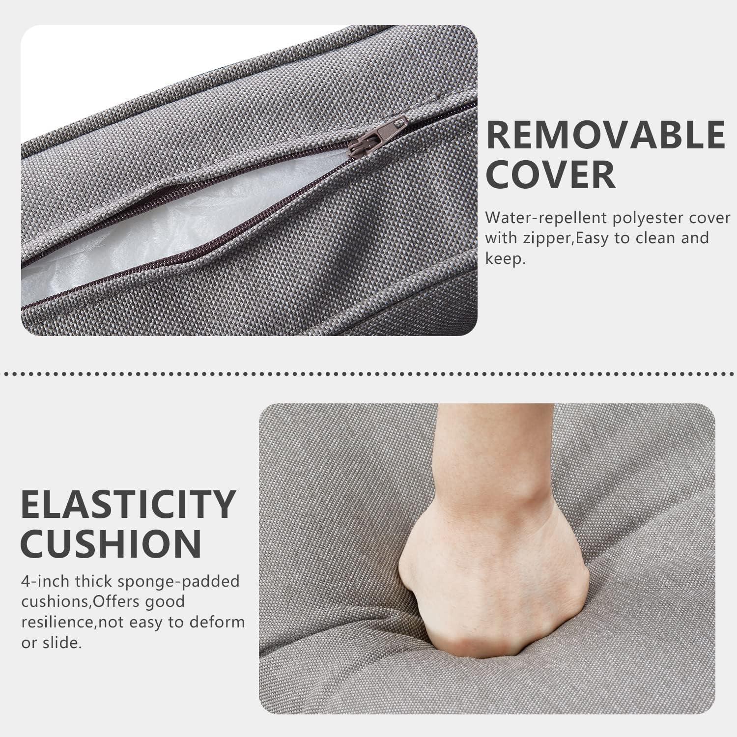 - 【Comfortable 4inch Thick Cushions】This outdoor furniture features deep and wide seats with 4-inch thick sponge-padded cushions,Offers good resilience, not easy to deform or slide, also protect your lumbar and offer a comfortable sitting experience.Water-repellent polyester cover with zipper,Easy to clean and keep.