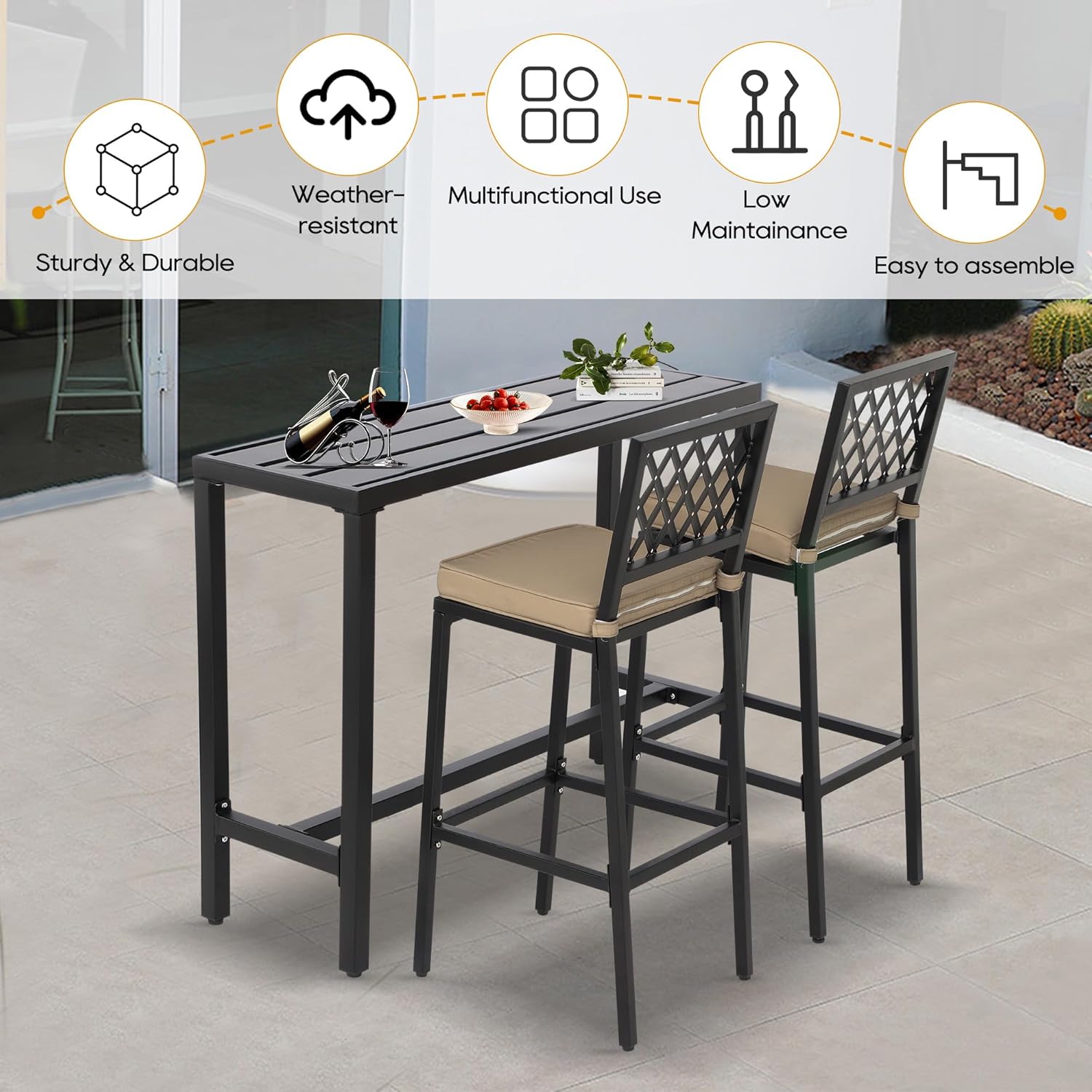 - Built to Last: Our patio pub set is made of reinforced metal frame, which is sturdy and durable for long time use. Besides, the powder coating makes the high dining bistro set weather-resistant, waterproof, and fade resistant, which is a great choice for indoor and outdoor use