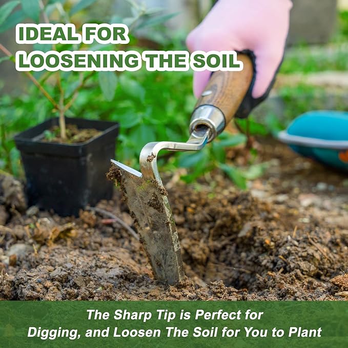 - 【Sturdy and Durable】The scraper hoe is made of thicker stainless steel, which is more durable, meaning it doesn’t bend like a cheaper hoe when you use it to dig, The Comfortable solid wood handle is ergonomically streamlined to fit the natural shape of the hand when holding and using it, helping to relieve strain on the arms and hands, even for prolonged use without tiring your hands.