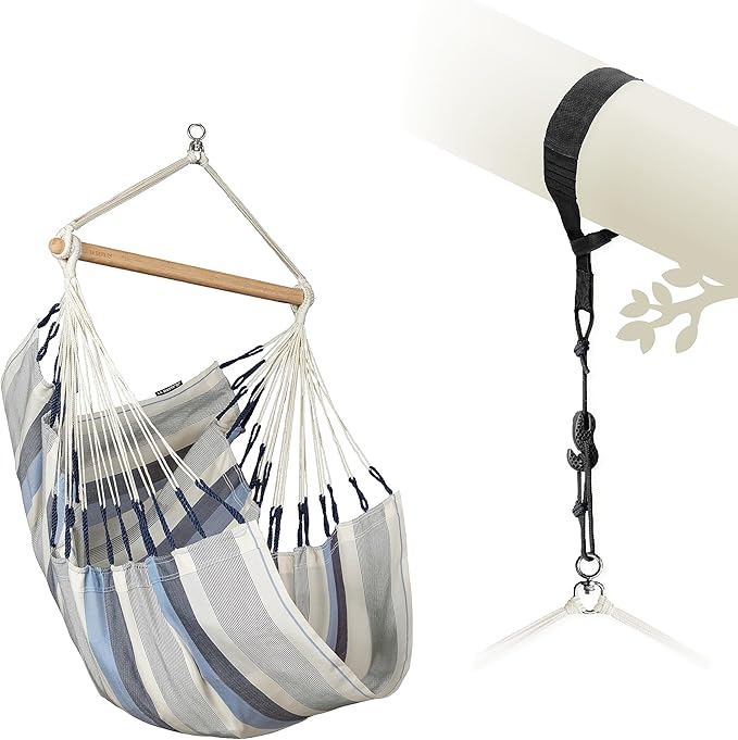 - TREE SUSPENSION MADE SIMPLE: Included in the package is our tree-friendly suspension kit, compatible with trees, round beams, and poles with a handy carabiner functionality. The patented SmartHook allows for hassle-free length adjustment, while extra-wide straps ensure a secure and gentle fit, making it the ideal hammock suspension kit for outdoor relaxation.