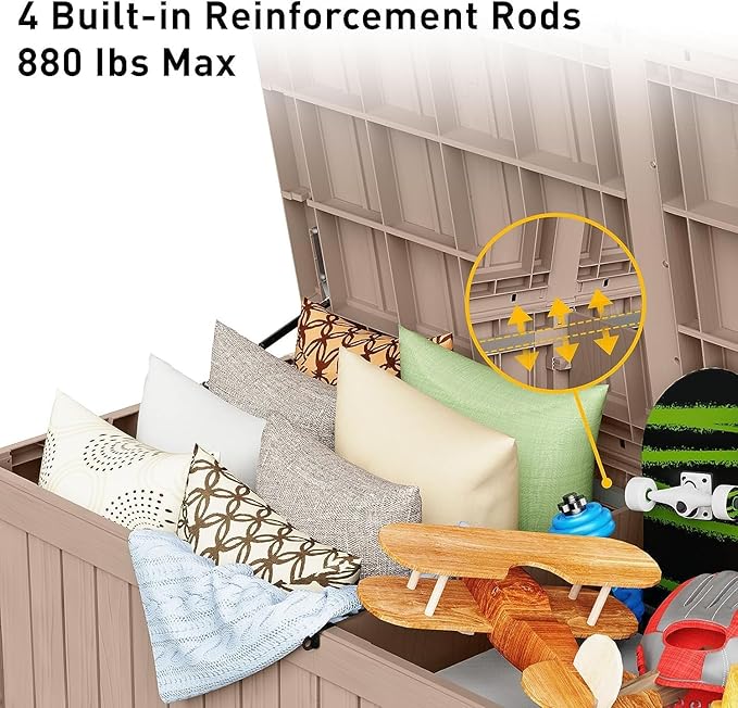 - ROBUST AND RELIABLE DESIGN - Engineered for heavy-duty use, this deck box can support up to 900 lbs, thanks to its reinforced metal rods and internal supports. Its thicker (0.08'') panels and precise assembly ensure superior stability and prevent warping or deformation over time.