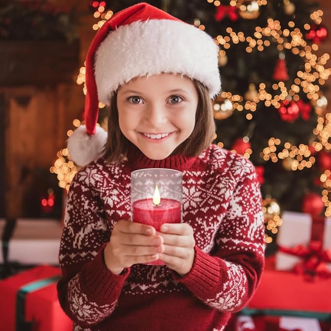 Flameless Flickering Remote Control Candle, Glass Pillar Candle,3 Pack (D:3"×H:4" 5" 6") LED 3D Flame Romantic Candle,Battery Operated Real Wax, Ideal for Wedding, Home Decor Holiday (Red)