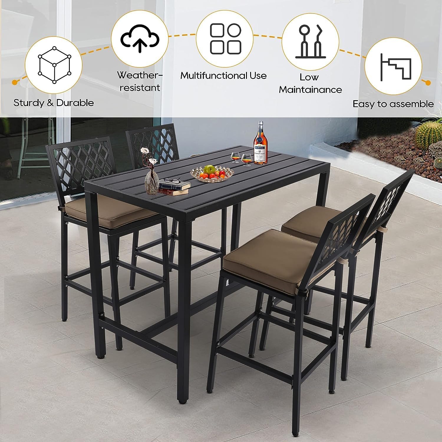 - 5-Piece Patio Bar Set: This 5-piece patio bar set includes 1 bar table and 4 bar stools is simple but sylish which could integrated with various decorations and scenes perfectly. It is a perfect choice for you to have a conversation, drink, enjoy leisure time with your families or friends