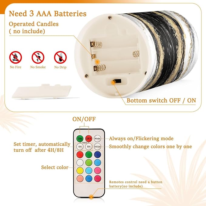 - Convenient Remote Functions: Includes an 18-key remote controller with a timer. You can control these candles remotely when they are placed somewhere difficult to touch. Set 4H/8H timers will save you trouble turning them on/off, they will come back on automatically at the same time every day. Also, you can adjust the light color as you want