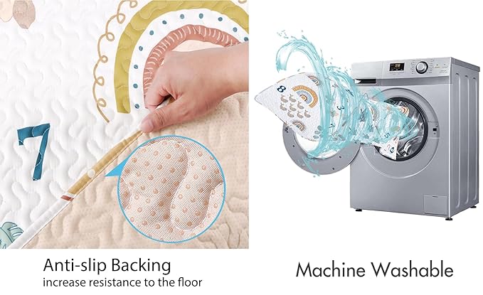 - Safe and Slip Resistant: Our 50x50 play mat for playpen features a soft microfiber surface that is Non-Toxic, with no plastic odor, and gentle on your baby's delicate skin. The polyester padding layer provides comfort for your little one. The underside of the baby mat is made of anti-slip rubber, so it stays securely in place.