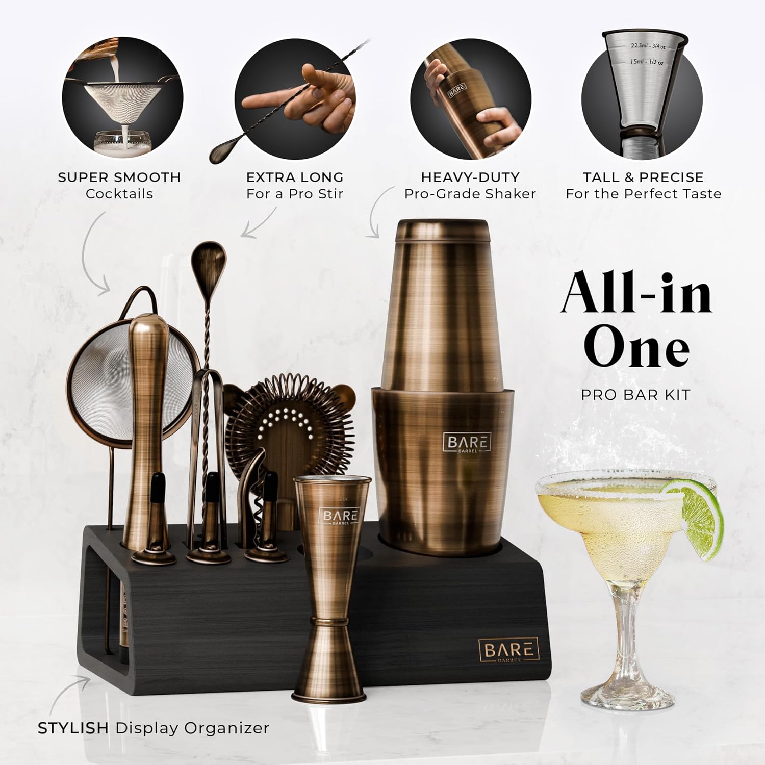 BARE BARREL® Mixology Bartender Kit Bar Set | 14-Piece Cocktail Shaker Set | Martini Barware Mixing Tools for Home Bartending | Incl. 35 Recipe Cards | Gift Set (28oz Boston Shaker, Brass/Black)