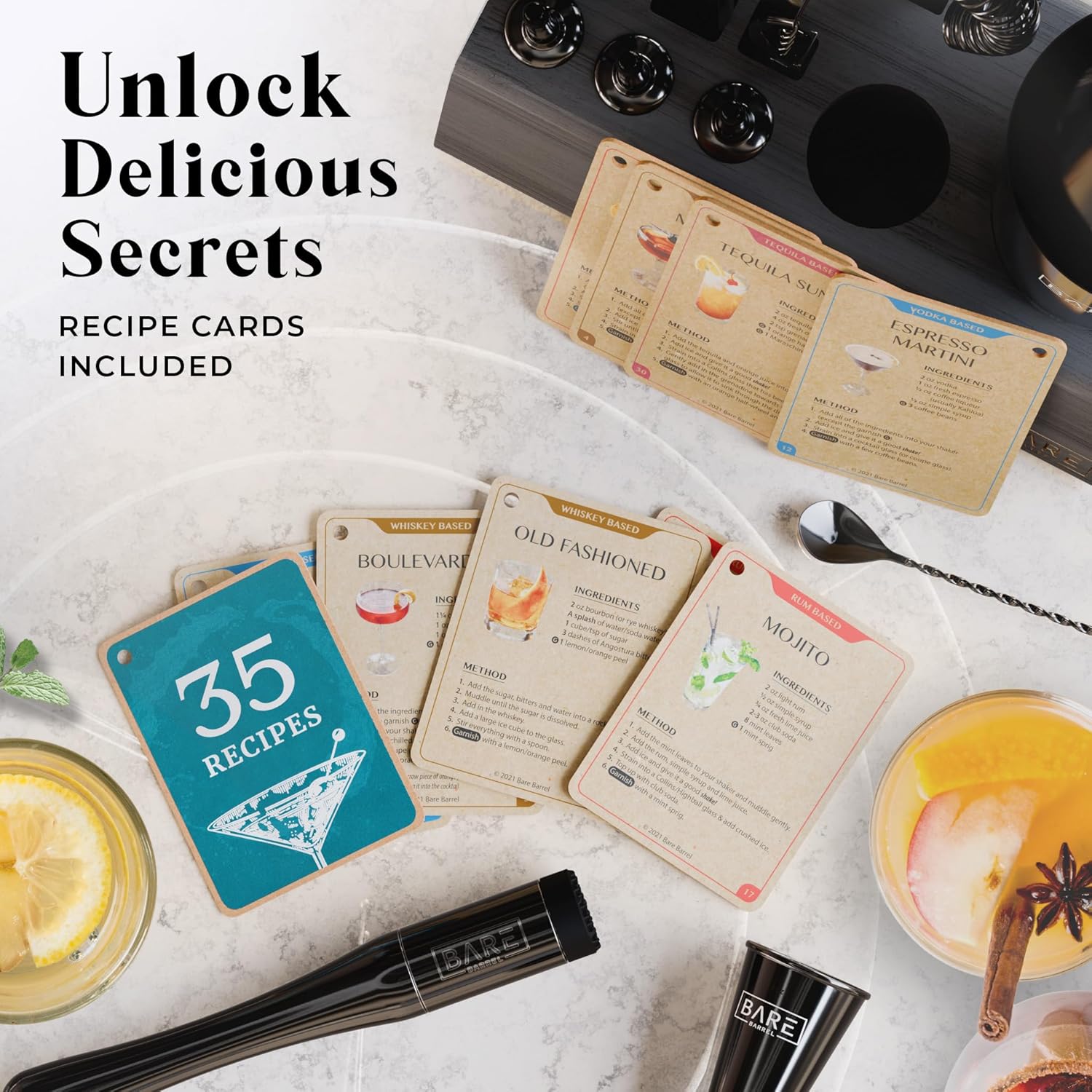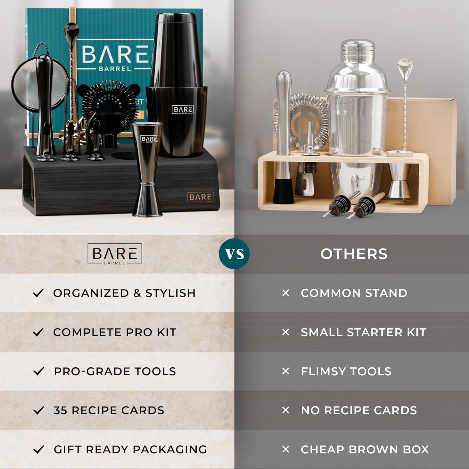BARE BARREL® Mixology Bartender Kit Bar Set | 14-Piece Cocktail Shaker Set | Martini Barware Mixing Tools for Home Bartending | Incl. 35 Recipe Cards | Gift Set (28oz Boston Shaker, Jet Black/Black)