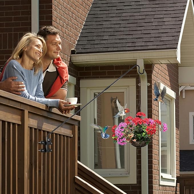 - INNOVATIVE DESIGN OF DECK HUMMINGBIRD FEEDER HANGER :Two sets of adjustable fixing clamp with 29-inch or 43-inch bird feeder pole allows you to place bird feeders or flower pots further away from your deck railing - Up high, or down low - whatever looks best for your deck and design.
