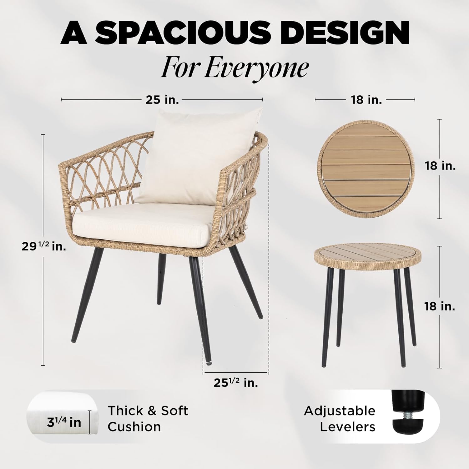 - 『MODERN BOHO OUTDOOR BISTRO SET 3 PIECE』Design a dream outdoor oasis with our patio bistro sets 3 piece; This bistro table and chairs set of 2 fits both indoor & outdoor, ideal for gathering & relaxing; Our wicker bistro patio set are easy to clean with a damp cloth. Product Dimension: Chair Dimension - 25"W x 25.5"D x 29.5"H ; Table Dimension - 18"W x 18"D x 18"H.
