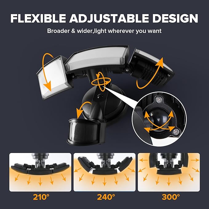 - Adjustable Design and Easy to Install: You can adjust the security light heads and the motion sensor head to different needs, which can provide extra brightness and more visible area. Coming with installation accessories, the security light can be be mounted on the wall in several wiring steps. IP65 waterproof rating ensures the light can work normally in severe weather