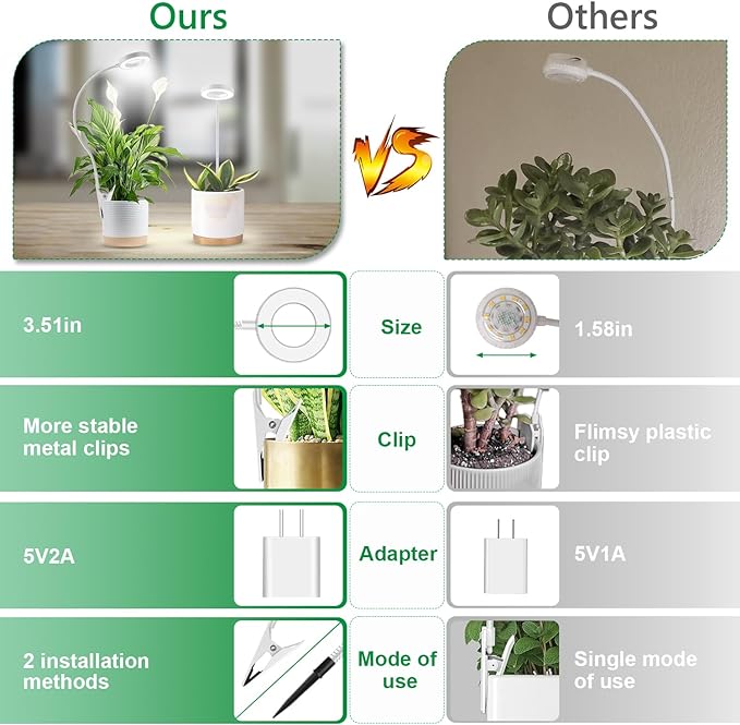 - Pot Clip Plant Light: This led grow lights have two installation methods; They can not only be clamped on the edge of pots, desktops or plant stands, but can also be inserted into the soil, making them flexible to use and not limited by scenarios