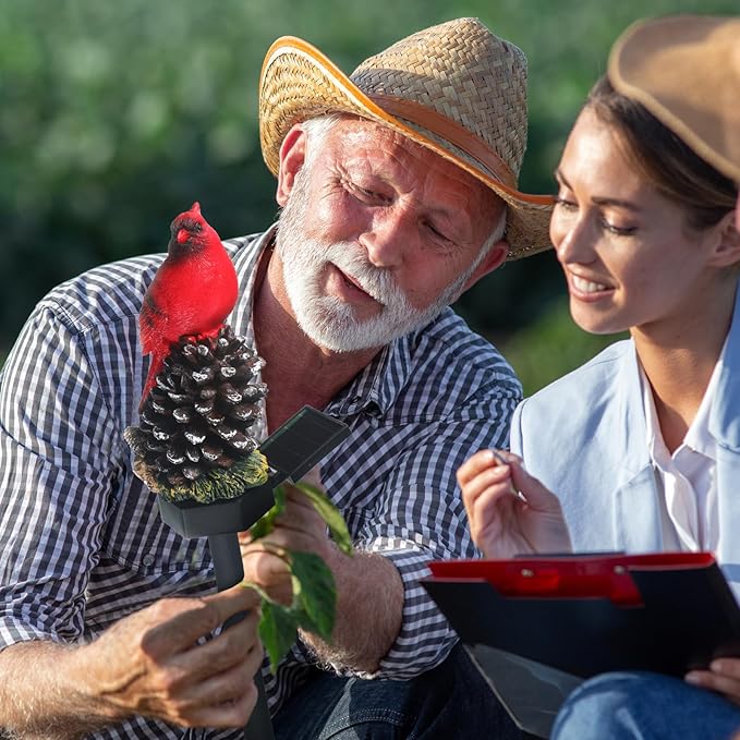 - Solar Powered Brilliance: our Christmas cardinal decors not just an adorable cardinal garden decor but also a practical outdoor lighting solution, this red bird light stake comes with built in solar technology, with no need for batteries or messy cords, making it an ideal option, turn on the switch under the base, stick in your garden, pathway, or cemetery decorations, and let it create a lovely atmosphere in the soft festive glow
