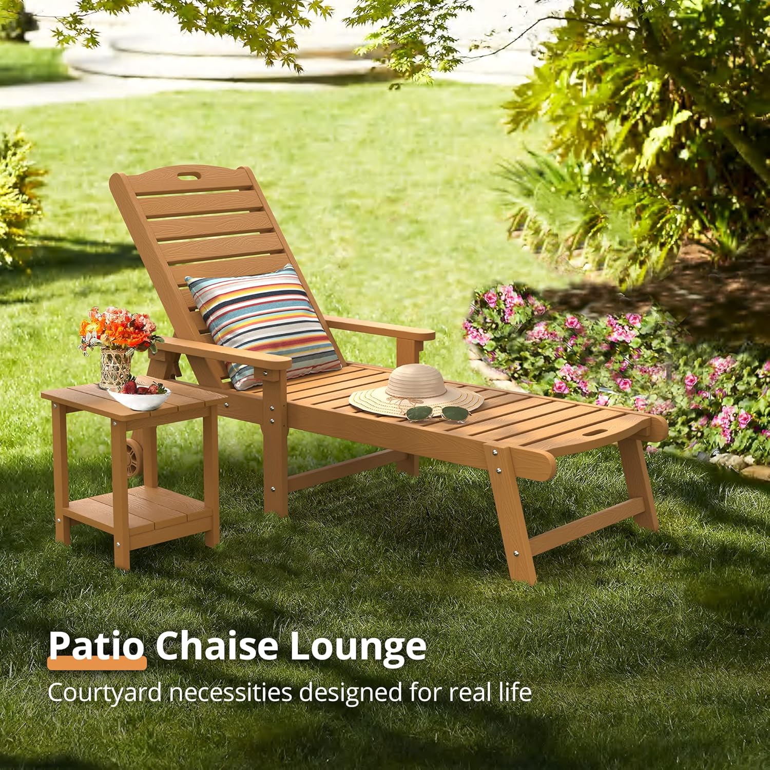 LUE BONA Chaise Lounge Chair with Table, 2-Piece, 79'' Oversized HDPS Chaise Lounger, 5 Positions Adjustable Lounge Chairs, Pool Lounge Chair with Wheels for Poolside, 3 Year Warranty, Teak Color