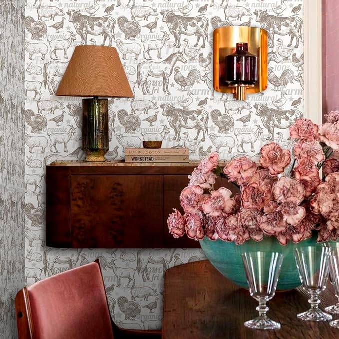 Boho Rustic Farm Animals Cow Rooster Horse Turkey Peel and Stick Wallpaper Self Adhesive Removable Easy Peel Off Stick on Wall Paper for Bedroom Cabinet Renter