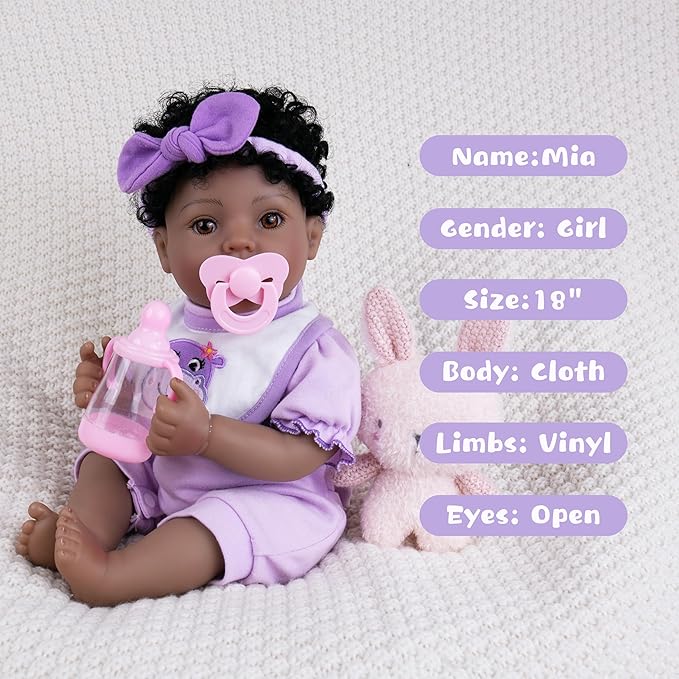 - Perfectly Sized Reborn Baby Dolls: At 18 inches tall, Mia’s the ideal size for kids to cuddle, carry, and treat like their very own baby. Her soft cloth body makes her a dream to hug, while being easy to clean and care for - no fuss, just endless love and nurturing play. Portable and ready for adventures, Mia goes wherever you do!