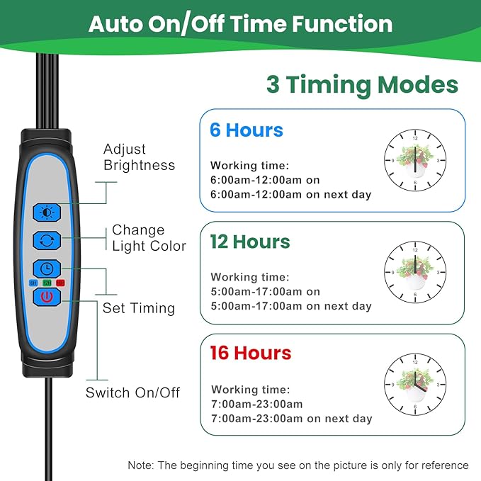 - [6 12 16H Timer]--Most of the plant lights with built-in controllers on the market do not exceed the timed 12H, and ours has been upgraded to exceed 12H, which is more friendly to light-loving plants, so that the plants grow better. Set the timing time(6H 12H 16H), you don’t need to manually turn on and off the grow light. The grow light will convenient to takes good care of your plants when you go out to work or on vacation