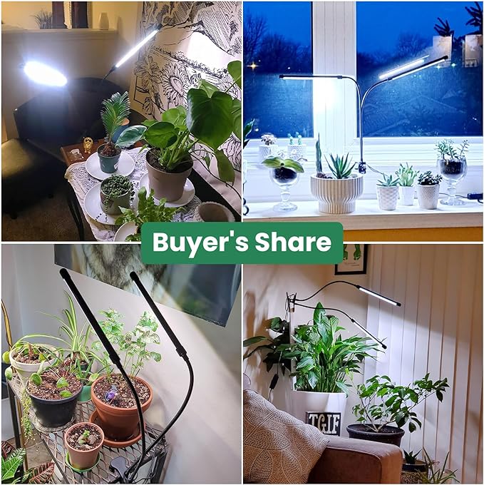 - [Full Spectrum & Cost-effective] This 2 heads grow light is equipped with 6 Red +14 White+20 Warm White LEDs for each light tube, the spectrum is close to natural sunlight, which is suitable for indoor plants in all growth stages, the light color is friendly to the eyes, low power consumption, energy saving, great for small plants.(Tips: one package includes 2 pieces this 2 heads grow light.)