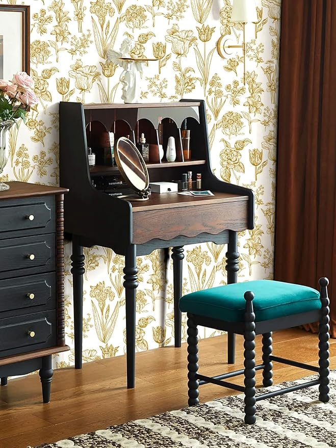 Dimoon 393"x17.3" Floral Wallpaper Peel and Stick Flowers Golden White Contact Paper Thicken Waterproof Modern Self Adhesive Plants Wallpaper Removable Wall Paper Shelf Vinyl Roll