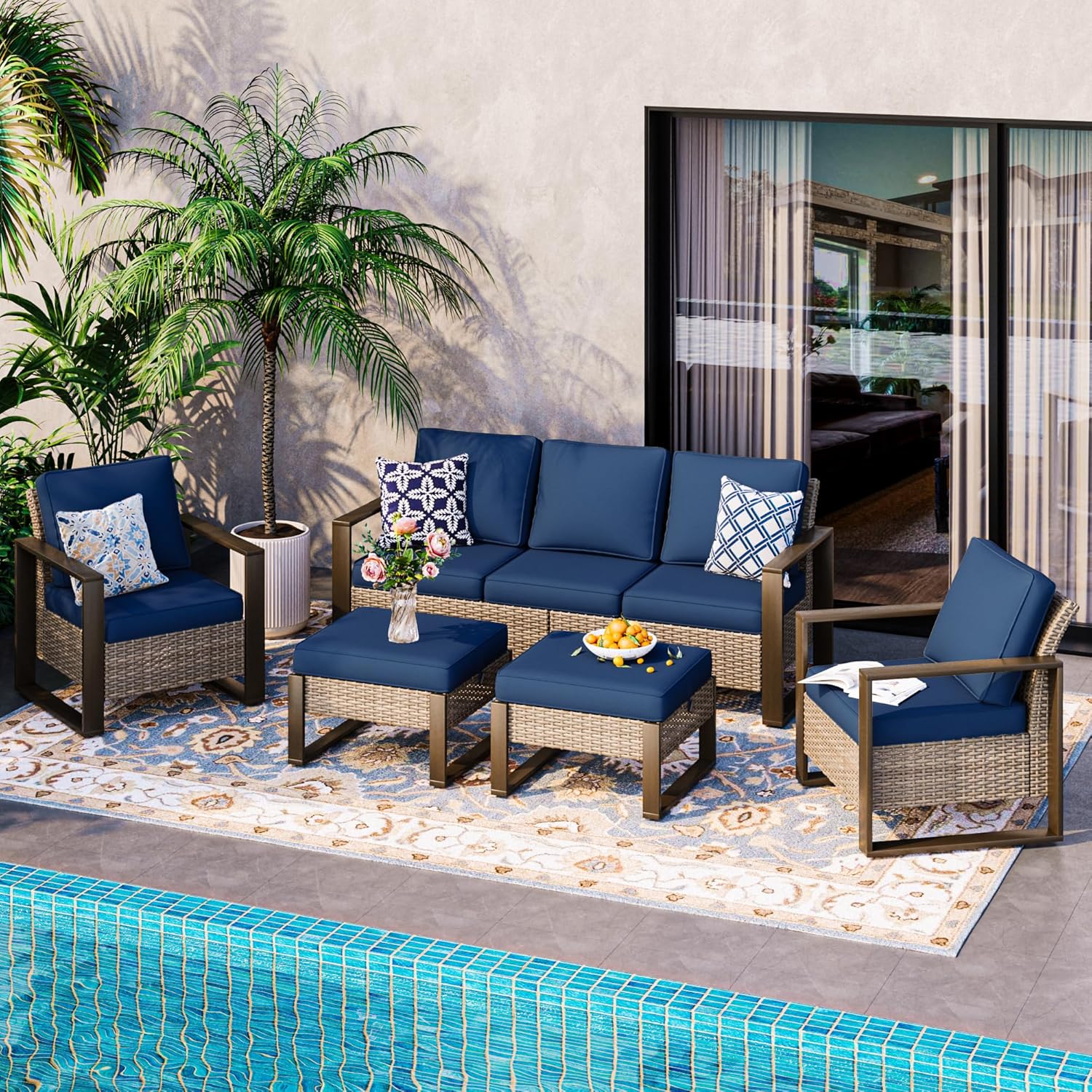 5 Pieces Metal Wicker Patio Furniture Set - 75" Sofa, Two Armchairs and Two Ottomans, All Weather Rattan Outdoor Conversation Furniture with Washable Cushion for Deck Porch, Dark Blue