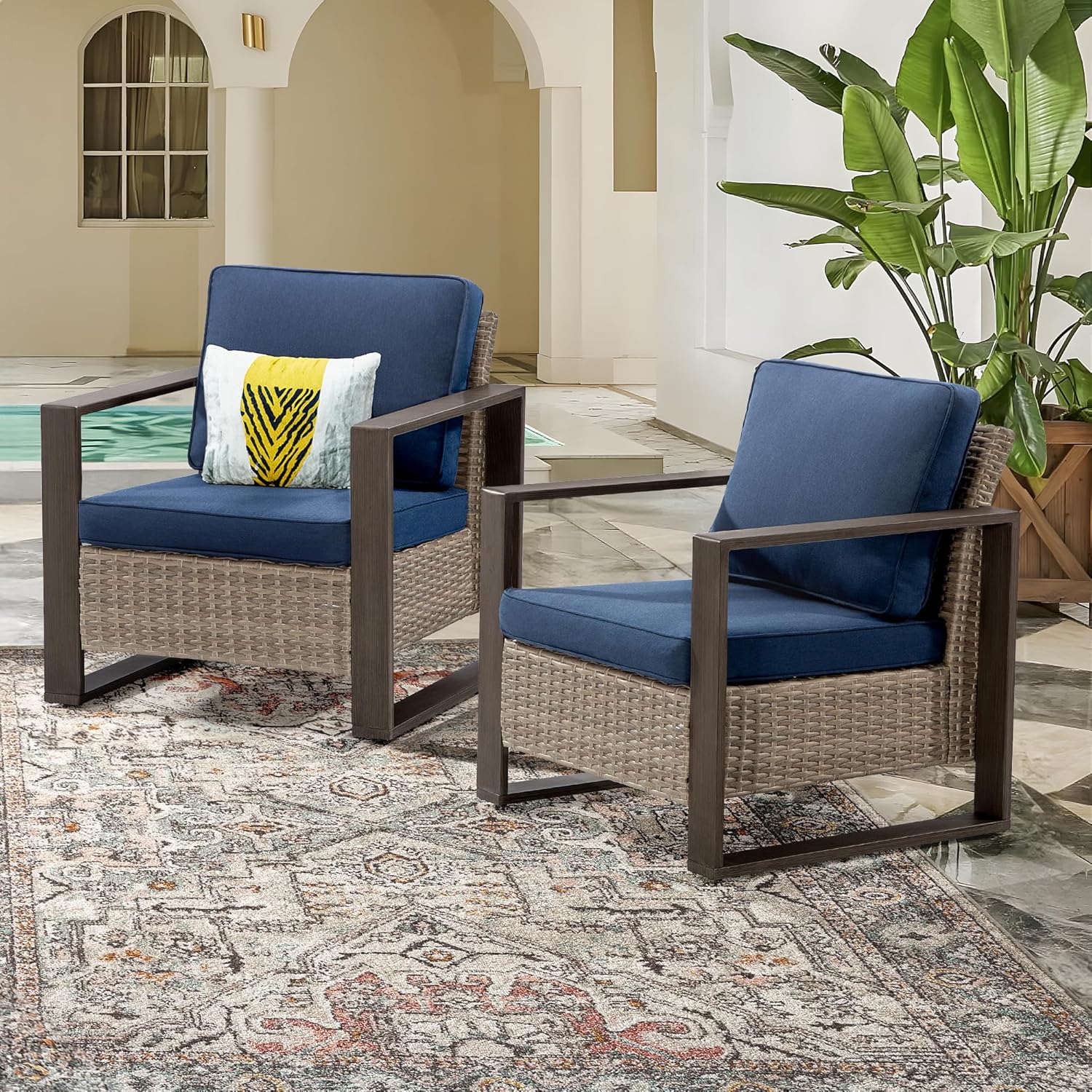 Patio Metal Wicker Chairs Set of 2, All Weather Outdoor Rattan Dining Chairs with Rectangular Framed Wood-Looking Armrest & Fade-Resistant Cushions for Deck Balcony Backyard, Dark Blue