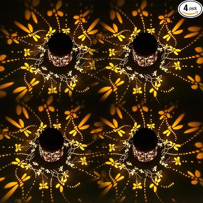 Mothers Day Gifts, 4 Packs Solar Lanterns Outdoor Hanging Lantern Lights, 4 Dragonfly Hollowed-Out Metal Decor Lantern, Waterproof LED Decorative Garden Light Gifts