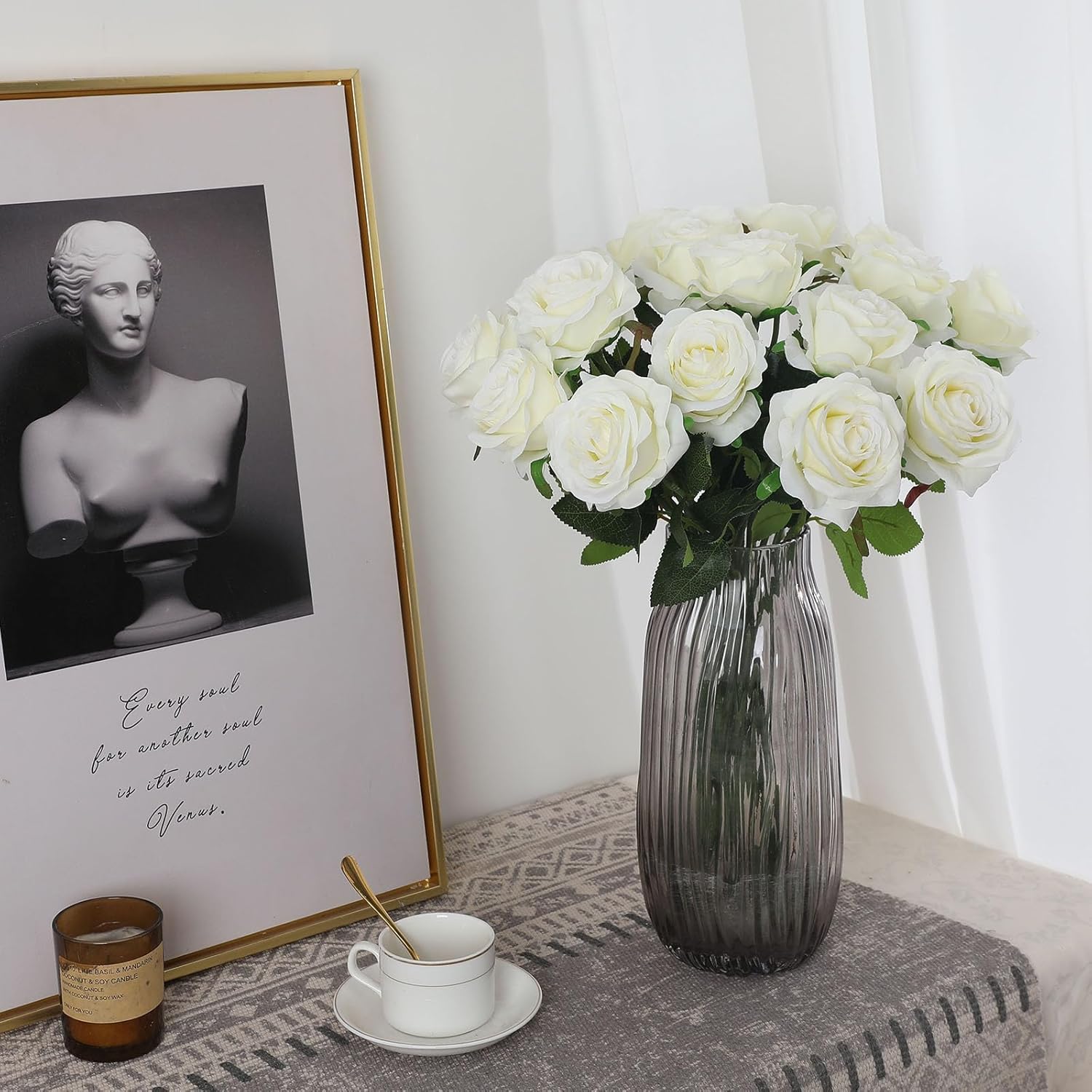 - Premium Quality Fake Roses: Rose flower head made of silk.Metal wire as skeleton,wrapped by plastic,can be cut or bent.Single stem white silk roses have silky( real touch ) flowers and (high realistic) leaves.It's classic design and Multiple color choices can meet your demands in all seasons