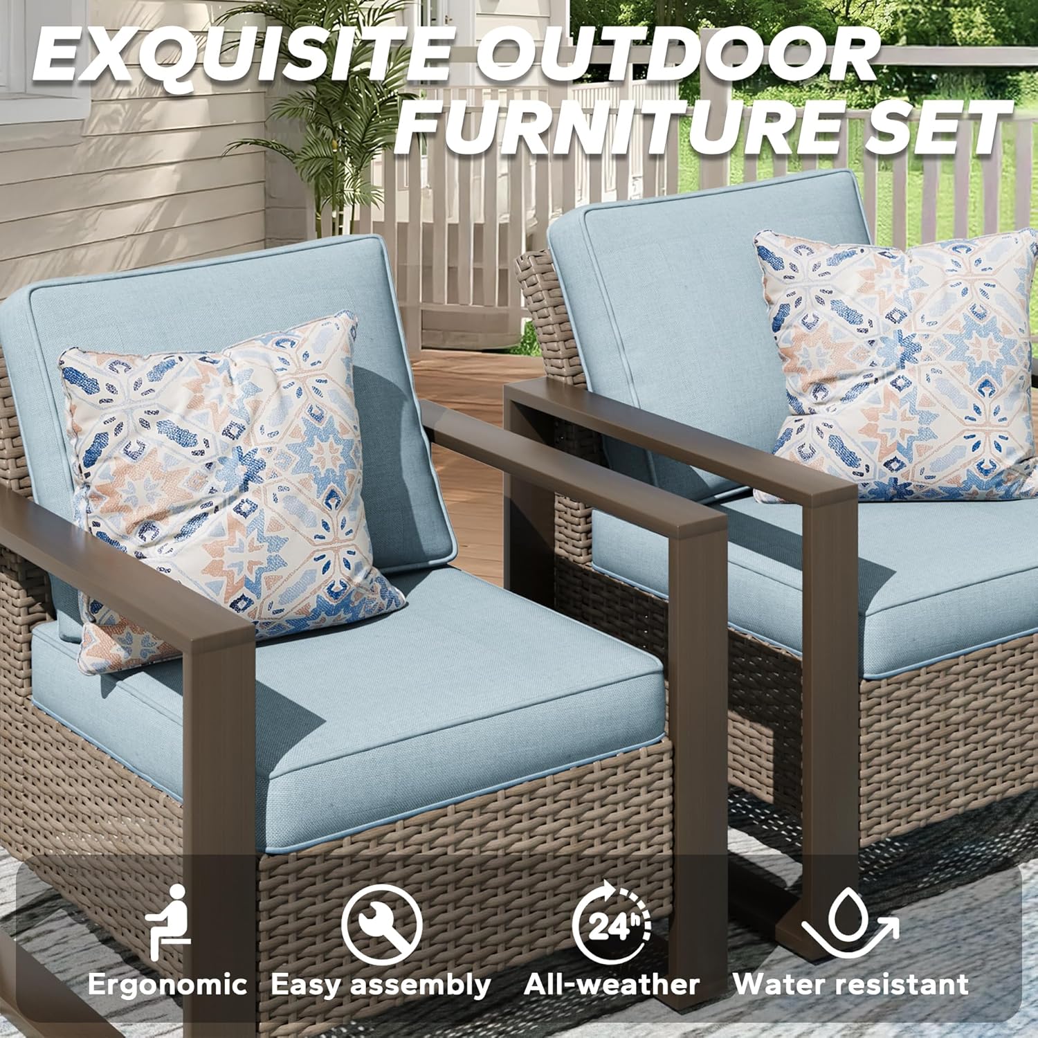 Outdoor Wicker Metal Chairs Set of 2 with Matching Side Table - 3 Pieces Patio Bistro Set with Removable Olefin Fabric Cushions & Rectangular Framed Wood-Looking Metal Armrest, Baby Blue