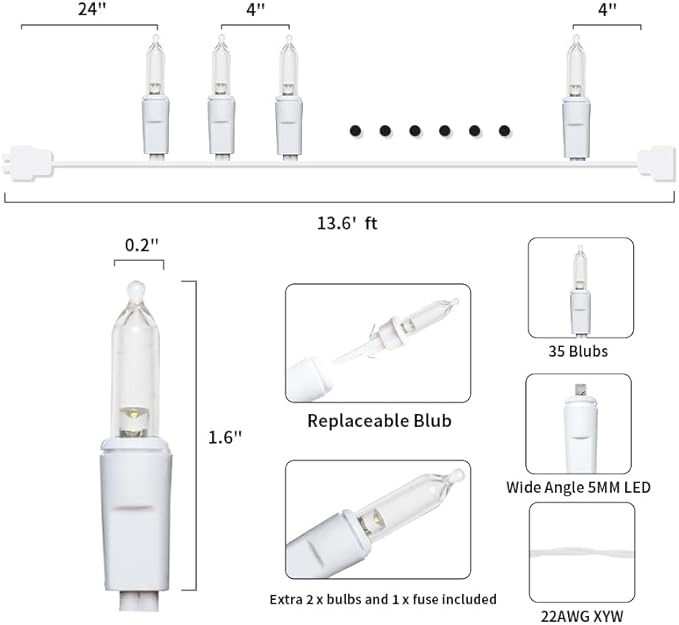 - 【Mini Christmas Lights Specification】: 1 Sets - white wire chritsmas light string includes 35 count cool white LED lights, total length 13.6ft, lights length 11ft and each led is 4 inches apart, 24 inches lead wire, 4 inches end connector (Extra 2 x bulbs and 1 x fuse included)