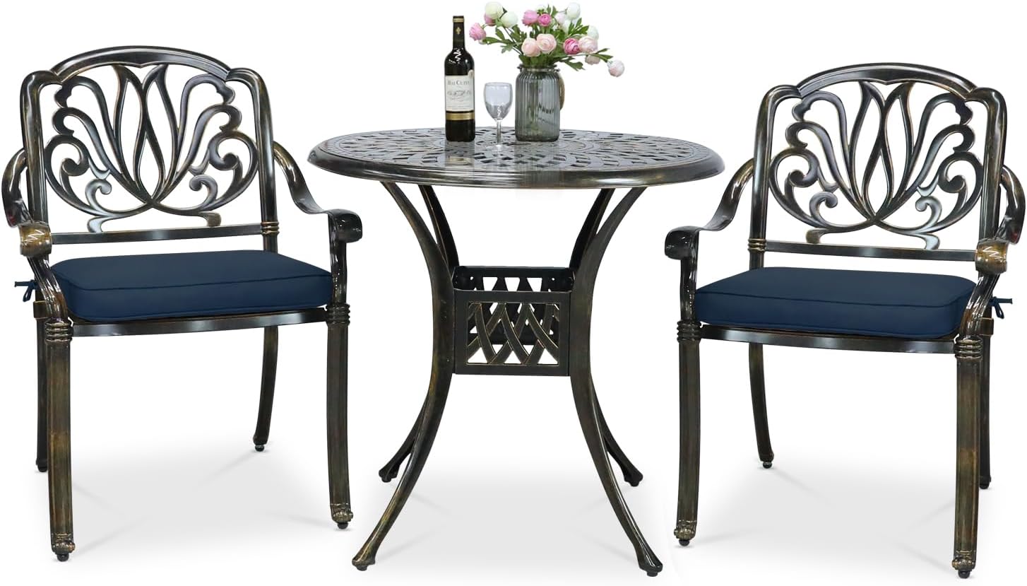 VIVIJASON 3-Piece Patio Furniture Dining Set, All-Weather Cast Aluminum Outdoor Bistro Set, Include 2 Chairs, 2 Cushions and 31" Round Table w/Umbrella Hole for Balcony, Backyard, Navy Blue Cushion