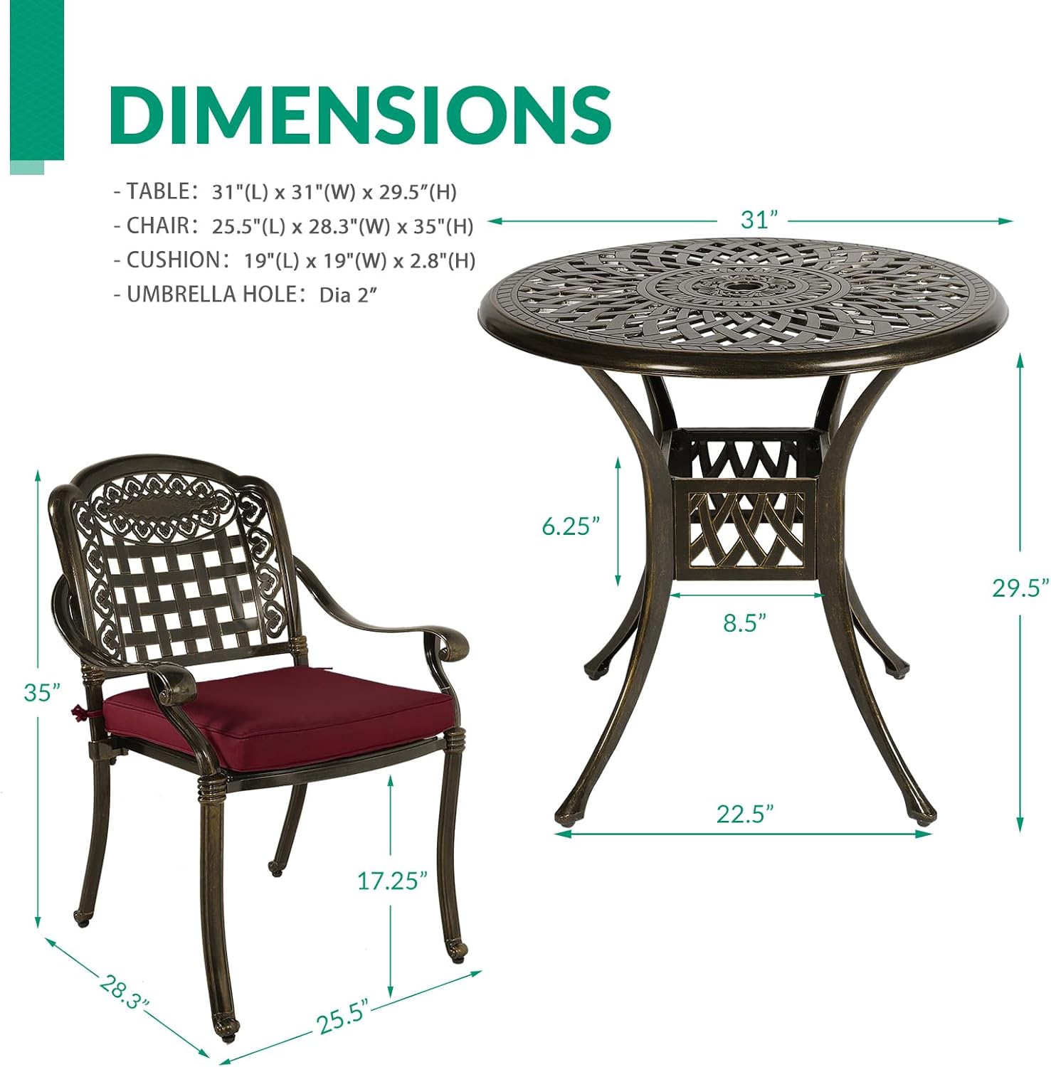 - 【STYLISH APPEARANCE】 - This 3-Piece Dining Set includes 2 stylish and comfortable chairs and 31" round cast table. Elegant cast accents scroll across the chairs and table top, adding a level of sophistication and craftsmanship to the collection. Perfect addition to your patio, yard, deck, or porch.
