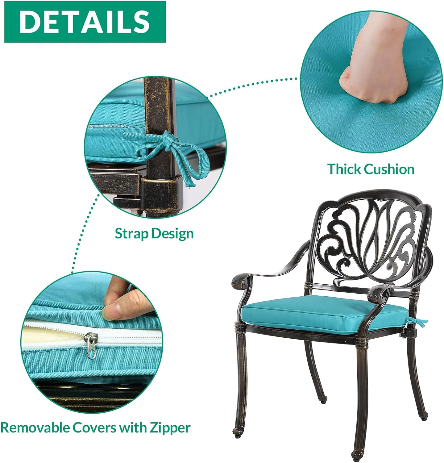VIVIJASON 3-Piece Patio Furniture Dining Set, All-Weather Cast Aluminum Outdoor Bistro Set, Include 2 Chairs, 2 Cushions and 31" Round Table w/Umbrella Hole for Balcony, Backyard, Ocean Blue Cushion